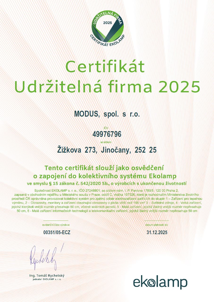 In accordance with the European Parliament and the European Council 2002/96/ES dated 27th January 2003 concerning electrical waste from electrical equipment as amended by European Parliament and Council regulation 2003/108/ES and according to valid Czech Republic law system we have joined the joint collective system operated by Ekolamp Co.