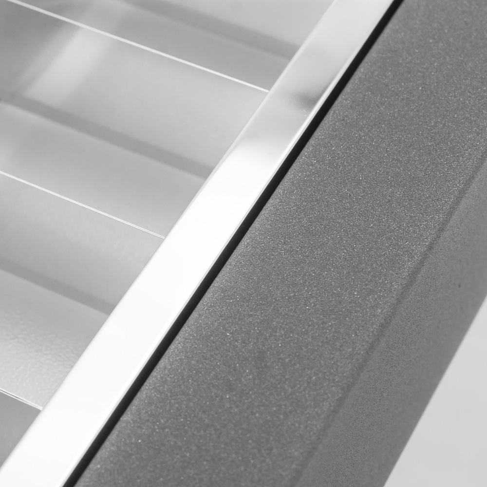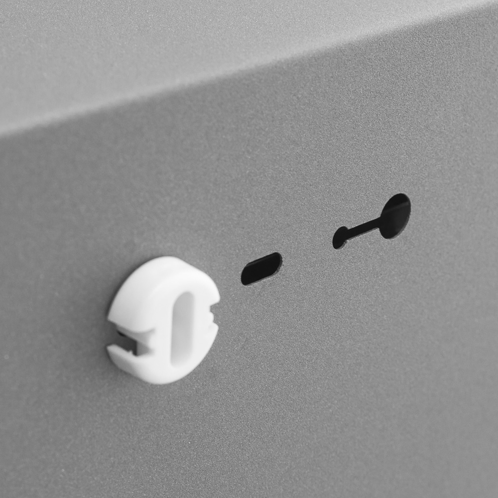 Šedě práškově lakovaný (RAL 9007) ocelový plech, na přání je možno svítidlo vyrobit v bílé barvě (RAL9003)