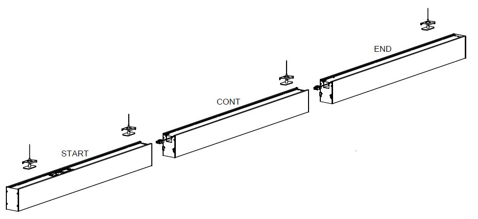 V provedení pro spojování do řad jsou tělesa dodávána s propojovacími čely osazenými spojovacími prvky. Sestavu řady lze vytvořit pomocí startovacích, průběžných a koncových svítidel.
