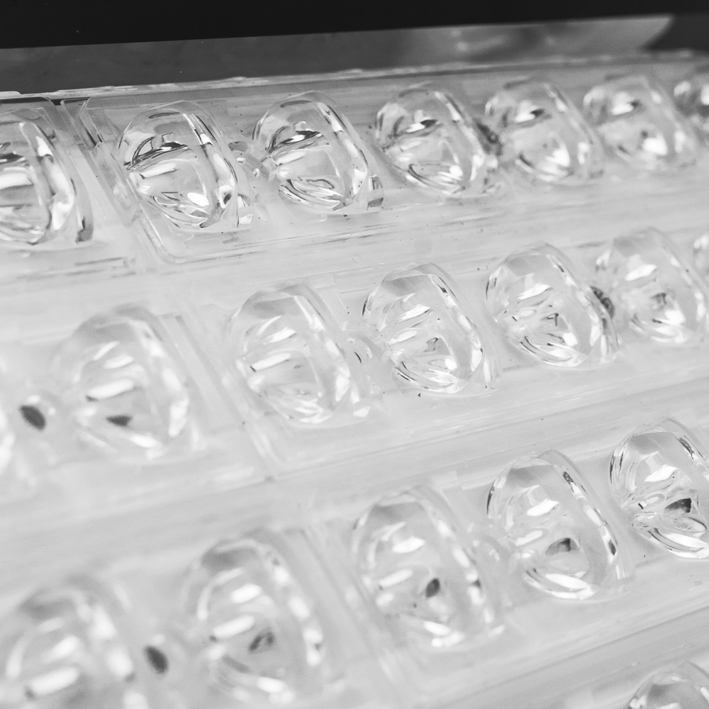 Svítidlo pro veřejné osvětlení, s čirým tvrzeným sklem a individuální plastovou optikou pro širokou distribuci světelného toku.